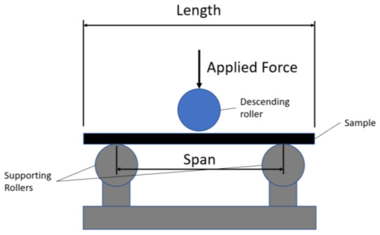 Supports and loading rollers of radius 5 ± 0.2 mm were used with a loading speed of 13.76 mm/min, in accordance with Equation (7), for a strain rate of 0.01 mm/min and 5.16 mm average sample thickness.