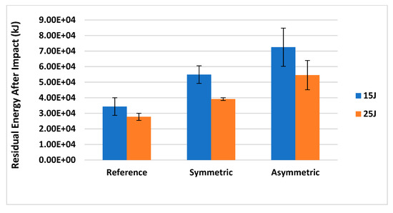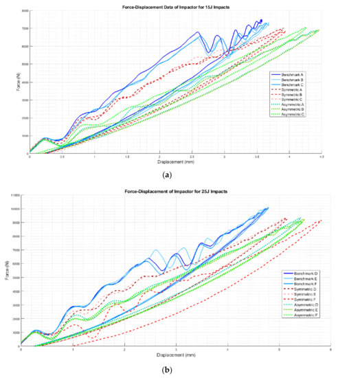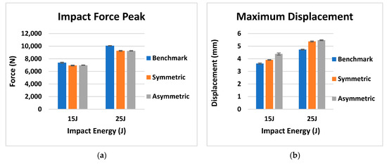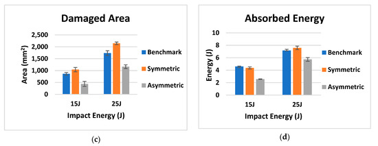 Force–displacement data from the 15 and 25 J impacts is shown in Figure 11 while the impact results, including the mean and standard deviation of the impact force, maximum displacement, damaged area and absorbed energy, are reported in Figure 12. In Table 3, the mean and standard deviation of the impact results for the different configurations are reported.
