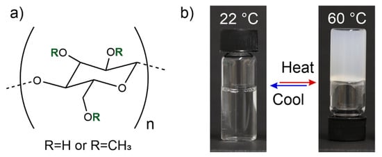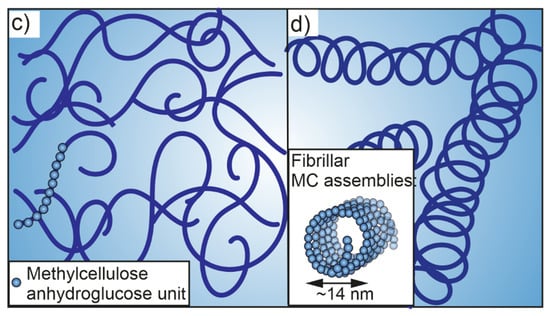 MC is the simplest chemical derivative of cellulose, where the available hydroxyl (-OH) groups on the cellulose polymer backbone are partially substituted with methoxyl (-OCH3) groups (Figure 1a) [25]. A suitable degree of substitution (typically 1.2–2.0) imbues MC with water solubility and fully reversible lower critical solution temperature (LCST) behavior, setting it apart from the native cellulose (Figure 1b–d) [26]. However, the molecular weight, concentration, degree of substitution, and substitution pattern along the MC chain affect the exact gelation conditions and characteristics [26,27,28,29]. Nonetheless, aqueous MC solutions typically convert into turbid gels when heated above ca. 40 °C and regain their transparency and flow properties upon cooling [30]. Upon the heating-induced gelation, the MC polymer chains transition from random coils to fibrillar aggregates, as schematically represented in Figure 1c,d), resulting in macroscopic mechanical stiffening and increased optical scattering.