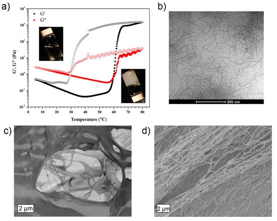 Thermoresponsive behavior of methylcellulose aqueous solution. (a) Development of storage (G′; black) and loss (G″; red) moduli of 1.4 wt% MC (molecular weight, MW 300,000) upon a heating (solid circles) and cooling (open circles) cycle. Insets show photographs of the sample at 25 °C and 75 °C. (b) Cryo-TEM image of 0.20 wt% MC solution (MW 300,000) above the LCST threshold reveals the fibrillar MC aggregates that form at elevated temperatures and facilitate gelation. (c) SEM micrograph of a 1% MC hydrogel freeze-dried from room temperature (ca. 22 °C) and then fractured. (d) SEM of a 1% MC hydrogel freeze-dried and fractured from 75 °C shows the enhanced presence of fibrillar structures. (a,b) adapted with permission from [57]. Copyright 2013 American Chemical Society. (c,d) adapted with permission from [31]. Copyright 2018 American Chemical Society.
