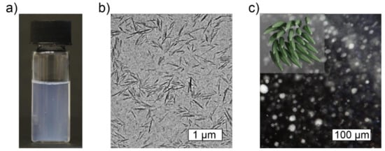 CNCs display lyotropic liquid crystalline behavior, that is, they spontaneously form liquid crystalline assemblies when dispersed in water at sufficiently high concentrations [88,89]. For example, the typical critical concentration (c*) required to trigger the onset of the phase separation of aqueous cotton-based CNCs into ordered liquid crystalline and disordered phase is approximately 3–4% [88]. While individual CNCs are structurally right-handedly twisted, collectively, they tend to form a left-handed chiral nematic, i.e., cholesteric, liquid crystalline assemblies (Figure 3c) [7,44,90]. The chirality can be retained of upon drying and used for templating hierarchical solids [47,91]. In nanocomposite hydrogels and solids, the organized assemblies may serve as an additional source of structural stability and as a template for anisotropic mechanical and optical properties, such as oriented swelling, birefringence, and structural colors [14,46,77,92,93,94,95]. However, achieving the c* and feasible CNC packing while being embedded inside a polymer matrix or a hydrogel may pose some challenges. On the other hand, the polymer network may also facilitate the packing via particle confinement or co-alignment [31]. Additionally, in polymer nanocomposites, the matrix polymer has been shown to form a semi-solid interface on top of the nanodopants, thus, contributing their effective size and volume fraction, and simultaneously lowering the actual c* and potential percolation threshold [96,97].
