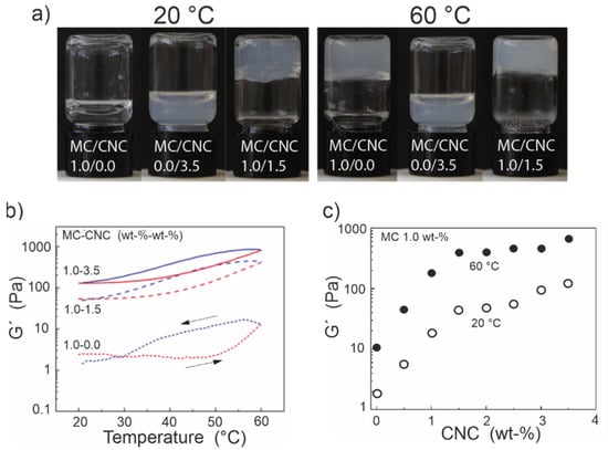 Mechanical properties of MC-CNC nanocomposite gels. (a) General appearance of pure MC, pure CNC, and a MC-CNC mixture compared at 20 °C and 60 °C. (b) Changes of storage moduli (G′) for three different MC-CNC nanocomposite hydrogels with heating and cooling cycle. The CNC content tunes the baseline stiffness when MC is kept constant, but all gels show fully reversible and thermally induced stiffening. (c) Storage modulus (G′) of MC-CNC hydrogels as a function of the CNC loading, when MC content is fixed, at 1% at 20 °C and 60 °C. Heating allows further reversible stiffening of ca. one order of magnitude. Note the logarithmic Y-axis scale. Adapted with permission from [31] (https://pubs.acs.org/doi/full/10.1021/acs.biomac.8b00392, date accessed on 3 September 2021). Copyright 2018 American Chemical Society.