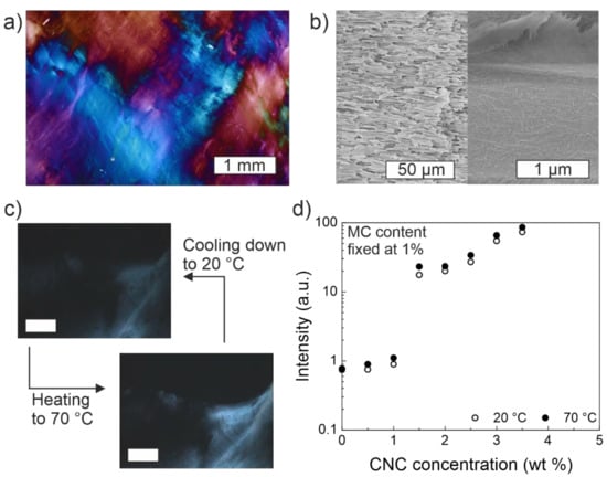 Birefringence in MC-CNC composite hydrogels. (a) MC-CNC 1–2.5% hydrogel imaged through crossed polarizers at 20 °C. A full-wave plate is used for enhanced colors. (b) SEM micrographs of a MC-CNC hydrogel freeze-dried and fractured from 70 °C at two different magnifications show CNCs dispersed in the MC medium. (c) The birefringence of MC-CNC gels intensifies upon heating to 70 °C and recovers upon cooling down to 20 °C. (d) Increase of birefringence intensity as a function of the hydrogels CNC content when MC is kept fixed at 1.0%. Note the logarithmic scale to highlight the differences also at the lower CNC loadings. Birefringence is visible above the intensity threshold of ~1. Adapted with permission from [31] (https://pubs.acs.org/doi/full/10.1021/acs.biomac.8b00392, date accessed on 3 September 2021). Copyright 2018 American Chemical Society.