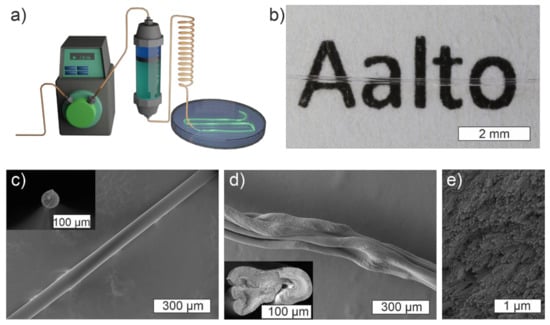 Methylcellulose solutions and MC-based nanocomposite gels at sufficient compositions can be extruded into fibers via wet-spinning, a process that has previously been applied to CNF hydrogels [49,106]. The solution, an MC-based hydrogel with a desired composition and potentially modified with dopants, is pumped through a thin capillary tube into a coagulation bath, where the extruded fiber solidifies (Figure 6) [106]. The capillary tube forces the gel into a fibrillar shape and exerts some shear alignment onto the material flowing through it. A pump, such as a syringe pump, guarantees the replicable and stable flow of the material. The process is performed at ambient temperature (ca. 22 °C) without the need for chemical crosslinkers. Typically, ethanol that is mildly polar and water-miscible is used as the coagulation anti-solvent. Ethanol replaces water in the MC structure and promotes interactions between the MC polymer chains, resulting in solid fibers. Finally, the fibers can be lifted from the coagulation bath and, after the drying and evaporation of ethanol, solid macroscopic fibers are obtained [36,49,106]. Since no covalent crosslinkers are used, the randomly oriented MC chains may rearrange and stretch within the fibers as a response to stress which makes them particularly ductile. As with hydrogels, adding dopants or reinforcing agents can be used to tune the processing and fiber properties. In general, high-aspect-ratio CNCs improve the wet strength, rigidity, and facilitate the handling of the nascent fibers, while, for instance, tiny gold nanoclusters are observed to soften the spinning dope and increase fiber softness similar to hydrogels [36,49].