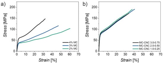 Mechanical properties of the MC-based fibers. (a) Stress–strain curves of pure MC fibers wet-spun from 2%, 3%, and 4% MC hydrogels (MW 88,000). Increased total solid content of gel appears to stiffen the resulting fibers. With low solid content, exceptional ductility above 50% is achieved. (b) Stress–strain curves of MC-CNC fibers with different total solid contents but with identical MC–CNC ratios (4:1). There the difference in total solid content of composite hydrogel is reflected mostly in the fiber diameter, whereas significant alterations in stiffness or ductility are not observed. Adapted with permission from [36]. Copyright 2021 John Wiley and Sons.