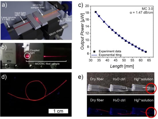 MC-based multifunctional optical fibers. (a) The attenuation of MC-based fibers has been studied with the cutback method, where the transmitted light intensity has been measured, the fiber shortened, and the measurement cycle repeated for several rounds. The results reveal signal attenuation per length of unit. (b) Photograph of an attenuation measurement system with an MC fiber coupled to a light source. (c) Representative attenuation measurement data (black circles) and mathematical fitting to the data (blue line). (d) MC fiber doped with gold nanoclusters (AuNC) is photoluminescent and shines red light upon UV irradiation. (e) AuNC-modified MC fiber as Hg2+ sensor. Under UV light, the absorption of Hg2+ ions (10 mM solution) into the MC-AuNC fiber quenches the luminescence providing a visual cue of the presence of Hg2+. The luminescence of a dry MC-AuNC fiber and a similar control fiber immersed in pure water remains unaltered. Adapted with permission from [36]. Copyright 2021 John Wiley and Sons.
