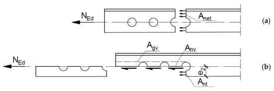 Eurocode EN 1993-1-8 [19] also requires checking block tearing in lap bolted connections. It distinguishes two cases: for a symmetric bolt group subjected to concentric loading, the use of Equation (9), and for a bolt group subjected to eccentric loading, Equation (10):