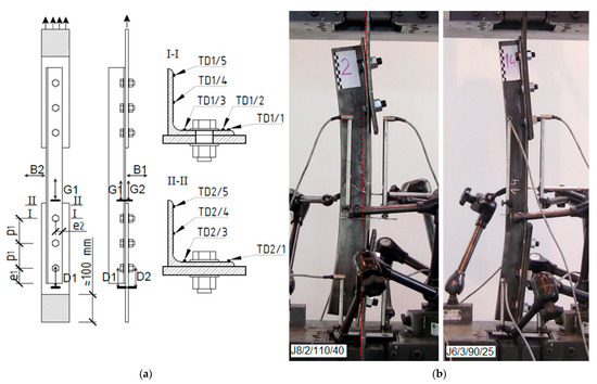 All tests were performed using an Instron 1200 kN-J1D testing machine. The investigations consisted of a monotonic tensioning process with displacement control until the destruction of the connection. The applied load and total elongation of the specimens were measured using load cell and displacement transducers built into the testing machine. To measure joint elongation (the local vertical displacements of the angle and gusset plate in one connection), inductive displacement sensors were positioned on both sides of the specimen. Reference points Gi and Di (where i = 1 or 2), used during the measurements, are shown in Figure 2a. In addition, two horizontal sensors, B1 and B2, monitored the displacement of selected points in two directions in the middle of the angle length, as shown in Figure 2. Additionally, for five specimens, strain gauges TDi with working lengths of 10 mm or 5 mm were used in the net cross section of the angle (I-I) and at a short distance from it (II-II) to monitor longitudinal strains. This placed the gauges at 40 mm for connections with M16 bolts or 50 mm for those with M20s.
