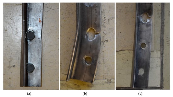 Failure modes of specimens: (a) shear of bolts “BF”, specimen J6/2/90/34; (b) tearing across the width of connected leg “FI”, specimen J8/2/80/30; (c) tearing developed towards outstanding leg “FP”, specimen J6/3/90/25.