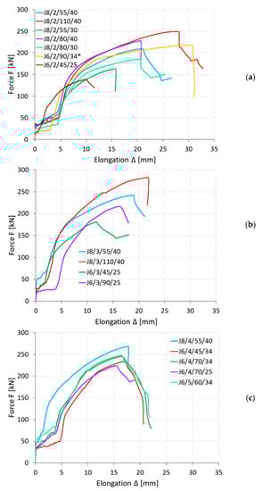 The basic data obtained from the experimental tests were the load–elongation (F–Δ) curves, as presented in Figure 4, for elements where angle failure was observed. To define the elongation Δ, the difference in displacement between the reference points Gi and Di was considered. Such measurements were carried out by inductive sensors positioned on both sides of the element (Figure 2) therefore, the Δ value was calculated as the arithmetic mean of the measurements on the left and right sides.