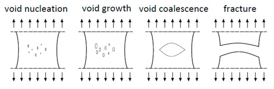 For metals, the process of crack initiation and propagation is associated with damage to the material microstructure. These defects, in the form of voids, appear at non-metallic inclusions or precipitates of another phase present in the material. During deformation, the voids grow and connect in a process called coalescence, creating a crack. The ductile fracture mechanism is shown in Figure 5.