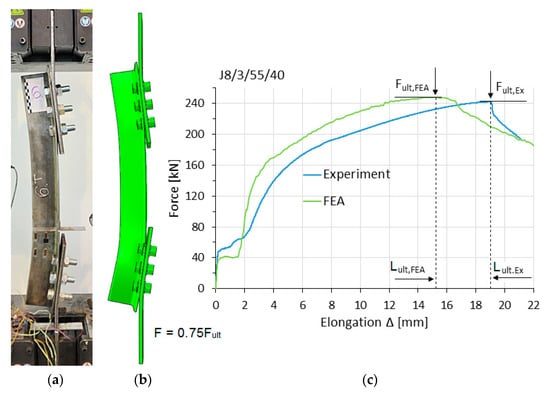 Specimen J8/3/55/40 in the failure phase: (a) experiment, (b) FE analysis (FEA) model, (c) F–Δ curves.