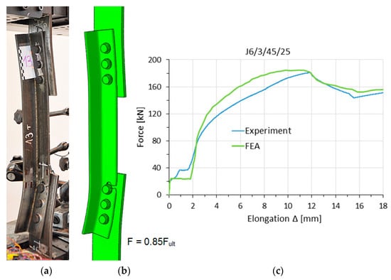 Specimen J6/3/45/25 in the failure phase: (a) experiment, (b) FEA model, (c) F–Δ curves.