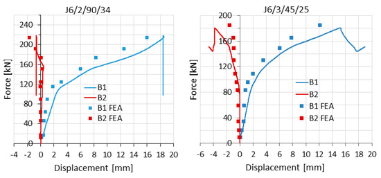 However, the numerical models were characterised by lower elongation compared to the experiments. The mean value of the relative difference ΔL (excluding element J6/2/90/34 for which elongation was measured by machine clamps) was −0.25 with a standard deviation of 0.12. The greater deformation of the test connections compared to those of the FE models can be explained by the influence of the bolt threads (not included in the FE model) and the non-concentric alignment of the bolts and bolt holes in the tested specimens.