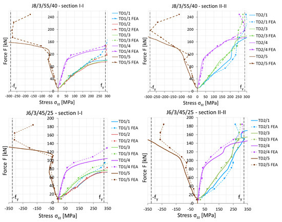 Comparison of longitudinal stress σzz values obtained from experimental tests and numerical simulations for example elements.