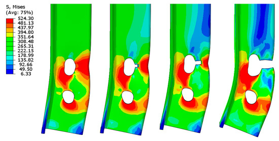 The sequence of crack initiation and propagation obtained in the numerical analyses (shown in Figure 13) was also identical to that observed during the tests.
