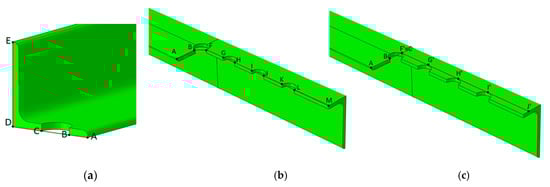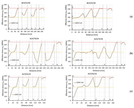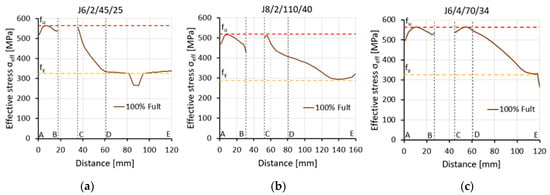 However, the ductile fracture propagation and its final position in the angle did not conclusively determine the failure mode. All fractures (in both testing and FE modelling) occurred or started between the bolt hole and the outer edge of the connected leg. This area coincided with the fracture area in block tearing (net area subjected to tension Ant) and the net area of the whole angle Anet, which controls the net cross-section failure. Therefore, to define which failure mode controlled the rupture process, the distribution of effective stresses (σeff, according to the Huber–Mises–Hencky hypothesis) in the net cross-section Anet and in the section under block tearing in all specimens was observed. The net cross section was considered along perpendicular lines A–D and D–E across the first internal bolt hole, as shown in Figure 14a. The section subject to block tearing was considered to be line A–B, crossing the net area subject to tension Ant, and the line starting from point F and ending in point M, defining the net area subject to shear Anv, as shown in Figure 14b. The distribution of effective stress was also considered to be along line A–B, crossing the net area subject to tension Ant, and the line between points F’ and J’, defining the gross area subject to shear Agv (Figure 14c).