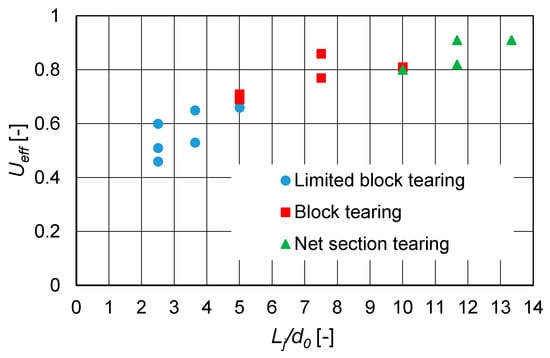 As shown in Figure 17, it was also observed that the failure mode and efficiency factor of the net cross section Ueff were dependent on the relative length of the bolted connections Lj/d0 (where Lj is the distance between the centres of the end fasteners in a joint, measured in the direction of force transfer, and d0 is the diameter of the bolt hole).