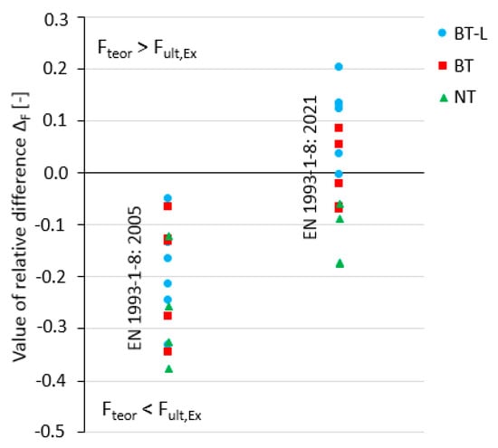 Comparison of relative difference ΔF between maximum tensile load obtained from experimental tests with theoretical resistance calculated according to Eurocode 3 (version from 2005 [19] and new proposal from 2021 [36]).