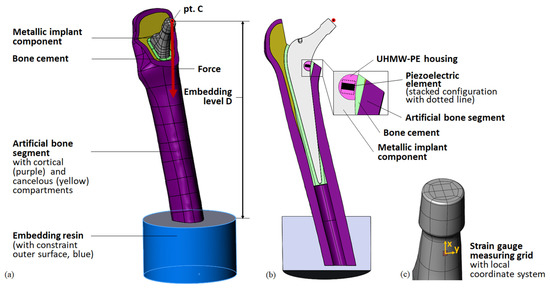 The implant geometry was derived from a previously 3D-scanned and reconstructed arbitrary cemented total hip stem (Exeter V40, size 37.5 mm N°3, Stryker, Howmedica Osteonics Corp, Mahwah, NJ, USA) [41]. All geometrical modelling was performed using SolidWorks 2018 (Dassault Systèmes, Vélizy-Villacoublay, France). The metallic prosthetic head was not modelled but was represented by the ball’s centre of rotation point C. Its position reflects the maximum allowed offset of 8 mm, prescribed by the manufacturer, resulting in the maximum lever arm of the acting hip contact force. From the medial part of the total hip stem, a cavity was excised. It contained the UHWM-PE housing in which the ring-shaped lead zirconate titanate (PZT) off-the-shelf piezoelectric multilayer element was placed (Figure 1b). As in our previous work, we studied a single piezoelectric element (PICMA® actuator, provided by PI Ceramic GmbH, Lederhose, Germany; outer diameter 5 mm, inner diameter 2.5 mm, height 2.5 mm, capacity 110 nF) and a stacked configuration of two elements (outer diameter 5 mm, inner diameter 2.5 mm, height 5 mm, capacity 220 nF). According to the manufacturer, a single piezoelectric element consists of 43 active layers (ca. 0.05 mm layer thickness) and a passive top and bottom layer (ca. 0.175 mm layer thickness). For the stacked configuration, two single elements were piled. The design and configurations of the integrated energy harvesting system were identical to our initial work [41] and are shown in Figure 1. To compare the numerically calculated implant loading with the experimental results, a strain gauge was modelled. A surface patch was generated on the implant’s lower neck, representing the measure grid of the strain gauge (see Figure 1c).