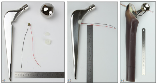 Implantation of a total hip replacement (THR) is a surgical treatment for hip joint-related diseases. This final measure is taken if conservative therapies fail and cannot resolve persistent symptoms that decrease the quality of life [1]. The main indication for THR is severe hip osteoarthritis [2]; osteoarthritis in general is one of the most common disabling diseases worldwide [3,4]. Due to the increase in the world population, its aging, and a more frequent use of THR in younger patients, THR shows a proceeding rise in surgeries per year in industrialised countries, which is projected to continue [5,6,7]. With regard to the clinical outcome and economic burden, THR revision surgeries should be avoided [8,9,10,11]. However, in spite of the low revision rate, the absolute number of secondary THRs will grow due to the larger number of primary THRs and the higher demands by a longer expected service life [7,12,13]. Therefore, research is conducted for the improvement of current THRs and the reduction of existing insufficiencies. Instrumented implants with sensory or active functions can lead to increased performance of THRs. Research and development towards better THRs are promoted by monitoring implant- or patient-specific parameters, like loadings or implant loosening detection [14]. Additionally, permanent clinical evaluation may prevent failure through adequate and early action. With regard to novel therapeutic measures, active functions like stimulation for bone ingrowth (e.g., electrical stimulation [15,16,17,18,19]) are considered.