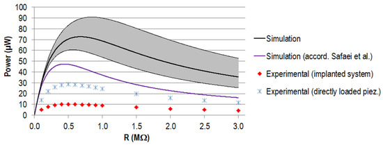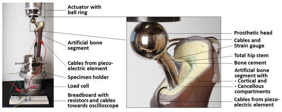 This work aimed to experimentally verify the performance of a new concept for energy harvesting in THR. We therefore proposed a reproducible setup for the experimental testing of a modified total hip stem implanted in an artificial bone segment. In an iterative FEA study, the loading situation from our previous physiologically based model was reproduced [41]. The results from the sensitivity analysis shed light on the important factors for the system’s mechanical behaviour, mechanical safety, and the generated power output. This is also of relevance for further optimising the system and regarding patient individuality. The experimentally determined voltage and power data were in good accordance with the numerically calculated curve progressions. However, the absolute magnitudes of experimentally generated voltage and the maximum power were notably lower. A simplified testing setup of the piezoelectric element only revealed discrepancies towards the numerical model. Depending on the research question, the numerical model requires an extension to enhance its predictive power. A first step could be calibration, as shown in Appendix A.2.