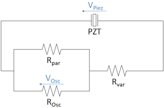 Measuring circuit of the piezoelectric element (PZT) for different load resistances with a voltage divider and an oscilloscope.