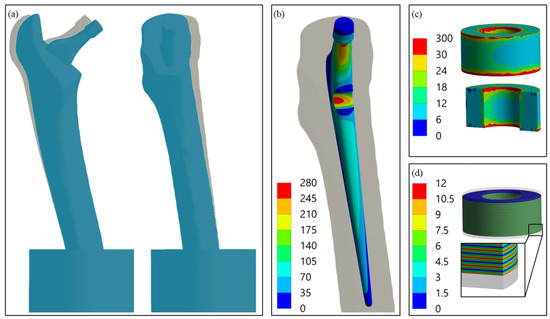 - Kluess, D.; Lange, H.-E.; Heyer, H.; Sander, M.; Mittelmeier, W.; Bader, R. Supplementary finite element analysis in experimental testing of total hip stems. Mater. Test. 2018, 60, 489–494. [Google Scholar] [CrossRef]