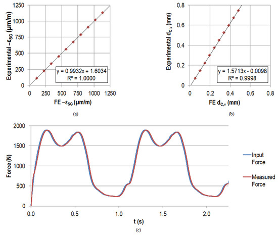 The regression model was used to scale the numerically calculated voltage curves for the Bergmann load profile with Equation (A1) below, assuming the contact force F33 from the FEA (194.93 N) and using the approach described in Section 2.1.6. Post-processing and Output Parameters. Values a and b were taken from the regression; the signum function was needed to account for the negative voltage values that would be lost by the square term.