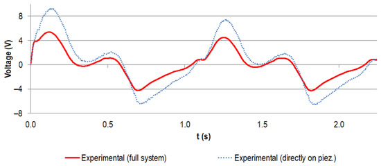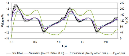 Additional testing of the piezoelectric element alone was performed to evaluate the predictive power of the numerical model used and to compare with the experiment of the implanted configuration. Therefore, the stacked piezoelectric multilayer element was directly loaded by the testing machine with a force profile scaled to the maximum contact force F33 of 194.93 N derived from the FEA. In other respects, all steps were performed according to Section 2.2.3.