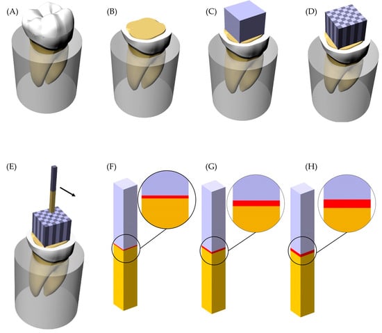 - May, L.G.; Kelly, J.R.; Bottino, M.A.; Hill, T. Effects of cement thickness and bonding on the failure loads of CAD/CAM ceramic crowns: Multi-physics FEA modeling and monotonic testing. Dent. Mater. 2012, 28, e99–e109. [Google Scholar] [CrossRef]