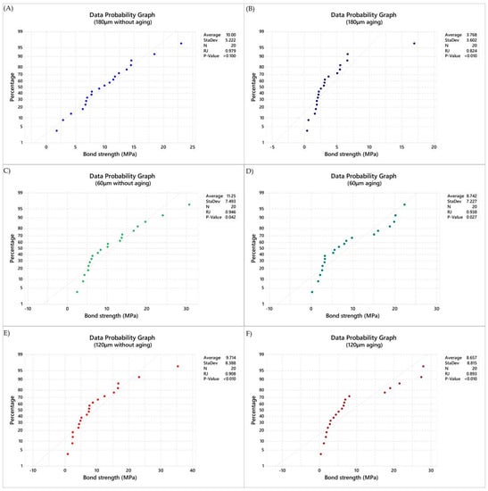 Normality data plot (Ryan–Joiner) applied in the present study. (A) Data probability graph in immediate tested samples with 180 μm of cement layer thickness, (B) Data probability graph in aged samples with 180 μm of cement layer thickness, (C) Data probability graph in immediate tested samples with 120 μm of cement layer thickness, (D) Data probability graph in aged samples with 120 μm of cement layer thickness, (E) Data probability graph in immediate tested samples with 60 μm of cement layer thickness, (F) Data probability graph in aged samples with 60 μm of cement layer thickness.