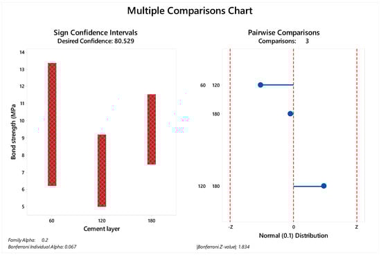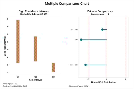 Multiple comparison chart for immediate tested groups (60, 120 and 180 µm). The sign of confidence was calculated considering family alpha = 0.2 and Bonferroni individual alpha = 0.067. The pairwise comparison demonstrated 1.83 as the Bonferroni Z-value without a visible difference between the evaluated cement layers.