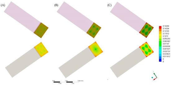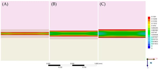 First principal stress (tensile) distribution in the cement layer for each evaluated group. (A) Models with 60 μm of cement layer thickness; (B) Models with 120 μm of cement layer thickness and (C) Models with 180 μm of cement layer thickness.