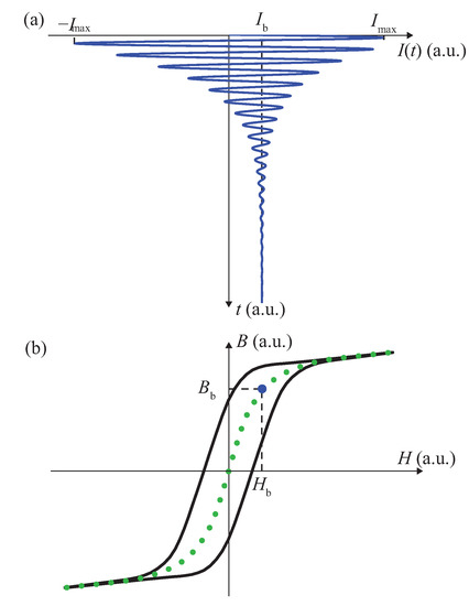 Magnetic excitation for the anhysteretic process (a), and the corresponding anhysteretic point (blue) of the complete anhysteretic curves (green) (b). This curve is included in the major magnetic loop. “a.u.” stands for “arbitrary units”.