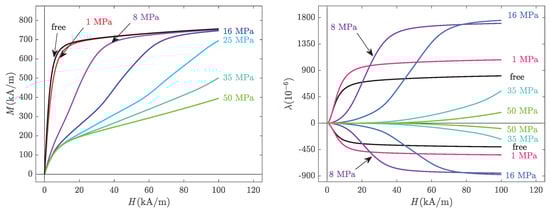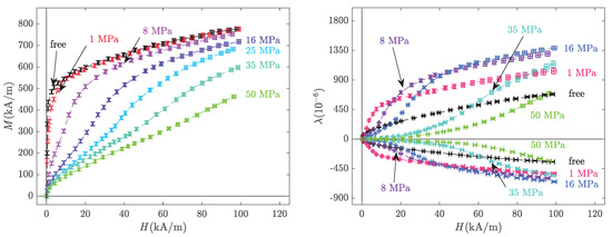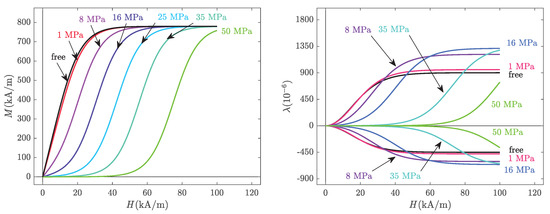 is a complementary term that can be introduced to consider the possible bias in the initial domain configuration, created for instance by residual stresses or shape anisotropy [44]. This configuration term (8) was chosen here as the result of the effect of a (fictitious) uniaxial pre-stress . In the following, this uniaxial pre-stress will be applied along the magnetic field direction , and will be treated as a material parameter.