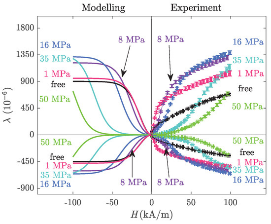 The modelling results are presented in Figure 4. It is recalled that except for the initial slope of the stress-free anhysteretic curve (to identify ) and the maximum stress-free magnetostriction strain (to identify ), the magneto-mechanical measurements were not used to feed the modelling, so the results of Figure 4 should be considered as independent predictive results (rather than interpolation results).
