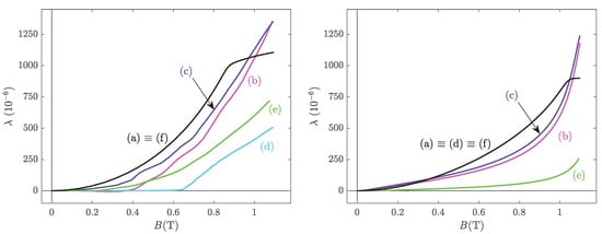 Once the material parameters of Table 2 were identified from two magnetisation and two magnetostriction curves, the analytical model can be validated using the remaining twenty magnetisation and twenty magnetostriction curves. For the sake of clarity, however, only part of the data were selected in the following figures, as for the previous ones. Figure 5 shows the magnetisation and magnetostriction curves of Terfenol-D obtained from the analytical Formulas (13) and (18), respectively.