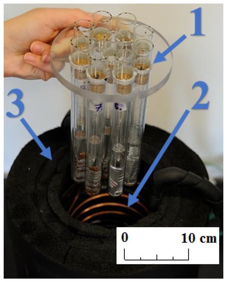 - Immersion of samples in the PCM: metal samples are placed into tubes filled with the PCM (at a temperature when the PCM is a liquid) and they are completely immersed in the PCM, after which they are kept at a constant temperature (when the PCM is a liquid) [7,8,9,10,11] or are tested in temperature cycles triggering phase transformation processes [3,4,5,6,13,17];