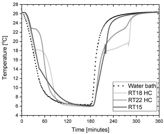 The presented experimental stand allowed us to conduct tests in an automatic mode, consisting of the cyclic increase and decrease of the temperature. The system was switched between the temperatures of 4 °C and 26 °C. An example of the cooling and heating cycle of the PCM during testing is shown in Figure 4.