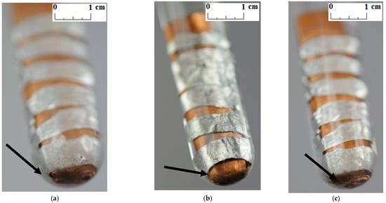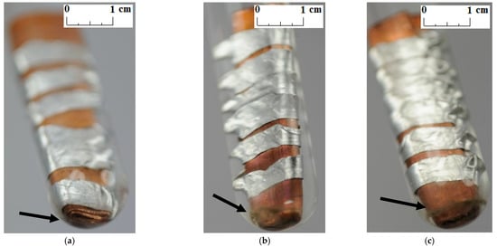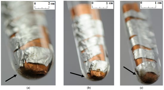 Unlike other studies [4,7,11,12], no change in the color and transparency of the PCMs was observed in any of the samples during the course of the test. Moreover, no gas bubbles were noticed on the metal surface. On the other hand, a precipitate was observed on the bottom of the test tubes in which the samples made of a combination of copper and aluminum were placed (see the arrows in Figure 5, Figure 6 and Figure 7). It was visible since the third week of testing. The amount of precipitate seems to have increased slightly over time. However, it is difficult to determine whether the sediment on the bottom of the tubes was caused by interaction between the PCMs and metal samples. These are not significant changes; however, it is advisable to conduct research over a longer period of time.