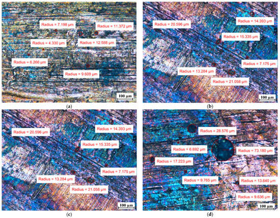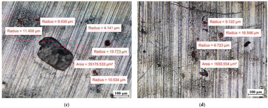 Comparing the surface of the samples that had no contact with PCMs with those that were immersed in PCMs, the degradation of the surface of aluminum was noticed. Although the surface of the aluminum samples showed defects with diameters ranging from ca. 10 µm to ca. 25 µm before immersion in the PCM, after 7 weeks of immersion the degradation increased. In addition to the areas with defects of diameters ranging between ca. 4 µm and 25 µm, the formation of local areas with numerous microdefects also showed up. Based on [13,31], it was assumed that the visible damage was due to corrosion processes, namely the pitting microcorrosion. The presence of pitting microcorrosion was visible for the aluminum samples placed in RT18 HC and RT22 HC.
