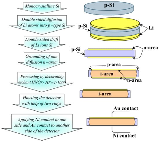 Despite the fact that lithium drift technology has been the subject of research for such a long time, Si(Li) detectors still remain a relevant research object. In recent work [], a method and hardware implementation of a segmented and nonsegmental lithium drift detector operating at room temperature was developed. Additionally, in [], the authors have developed a novel type of n+-i- n-p large-area silicon microstrip sensors for very high-radiation environments. Si(Li) p-i-n detectors were also successfully used for the CBERS project in []. These detectors have opened up new possibilities for registering gamma- and X-rays.