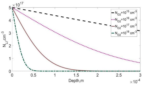 Under intensive formation of Li-O complexes, the value of can be significantly high, which can lead to the decrease of the effective diffusion coefficient (see Figure 2). On the other hand, the absence of a coordinate dependence of the diffusion coefficient of lithium in the form of dependence (10) can make it possible to use the well-known solution of the diffusion Equation (7) for this case (see Figure 3).