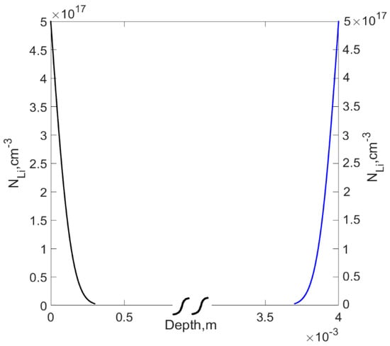 Double-sided diffusion profile of Li atoms into Si, at a temperature T = 420 °C, to the depth of 300 µm from both sides of the Si crystal.