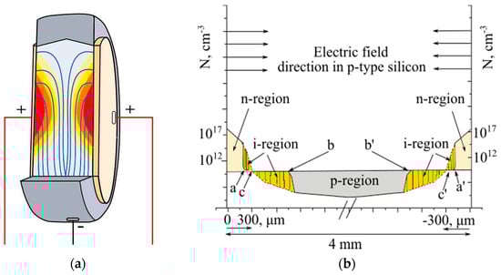 The degree of compensation in lithium-drift technology of p-i-n structures depends on the temperature-field regimes []. By choosing the optimum values of the reverse bias voltage and the drift temperature, it is possible to achieve the maximum degree of compensation, which is characterized by the volume charge in the considered point c and c′, shown in Figure 4, of the compensated i-region. Table 1 shows the experimental data on the mode of reverse bias voltage and temperature, which gradually increase with the expansion of the compensated i-region.