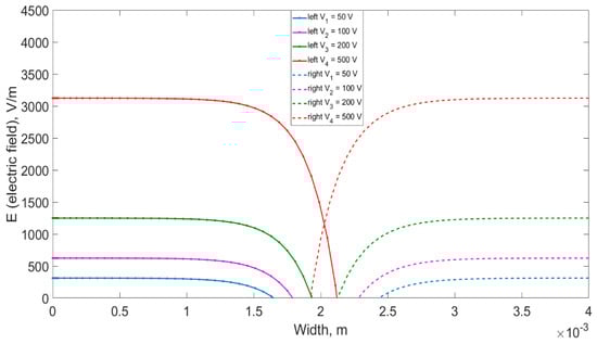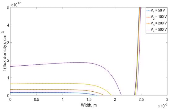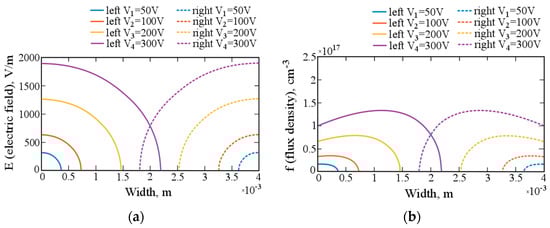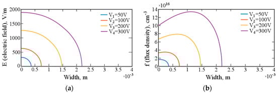 In the case of double-sided drift of lithium-ions into a silicon monocrystal, it is necessary to jointly solve Equation (14) to obtain the dependence of the electric field on the depth. Figure 6a shows the electric fields in a crystal for double-sided drift. With an increase in the voltage applied to the crystal, the depth of action of the field increases, and, consequently, the drift velocity and the flux of carriers of charge also increase.