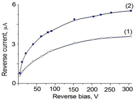 After preparation of a Si(Li) p-i-n detector’s structure, the I–V characteristics during application of reverse bias voltage were investigated (see Figure 10). Here, I–V for silicon wafers obtained from high-resistance silicon grown by the float-zone method (line 2) and low-resistance silicon grown by the Czochralski process (line 1) were compared.