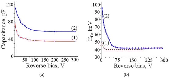 The same samples, which were used to investigate the I–V characteristics, were used to study capacity–voltage and noise–voltage characteristics. In Figure 11a, the capacity–voltage characteristics of the Si(Li) p-i-n structure are shown. The capacitance of the Si(Li) p-i-n structure is directly connected with the thickness of the depletion layer and with a specific resistance of the initial material. Therefore, by measuring this, it is possible to identify the specific resistance of the compensated area of silicon in the prepared structure and predict the values of maximum energy of the charged particle, under the conditions of its total absorption in the depletion layer.