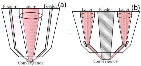 Schematic diagram of typical two feeding methods. (a) Laser outside powder feeding; (b) laser inside powder feeding.